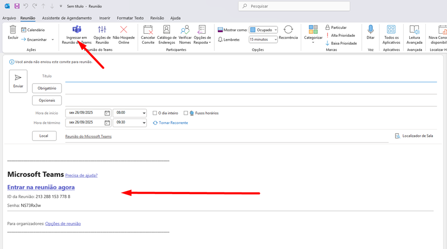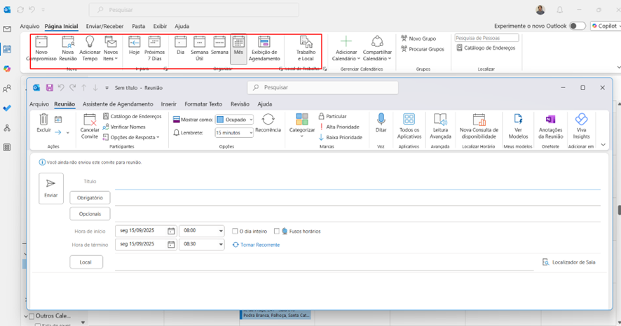 - Quando você vai ao calendário do Outlook Desktop para criar uma reunião, o botão Reunião do Teams está ausente.