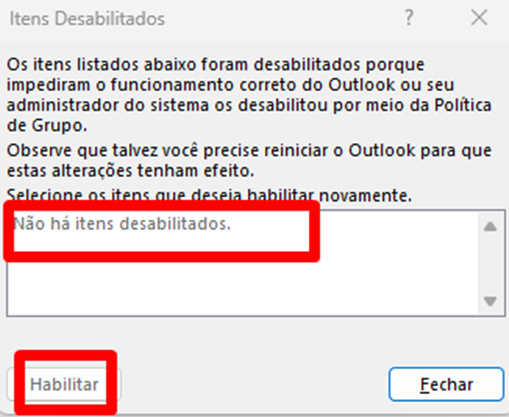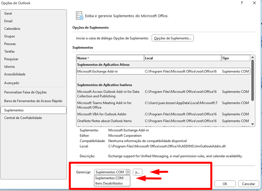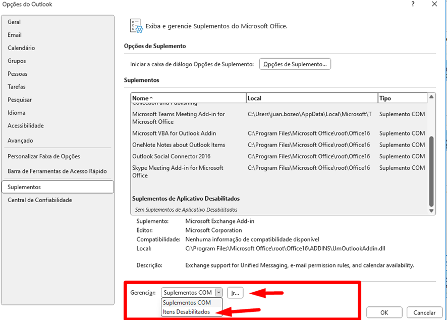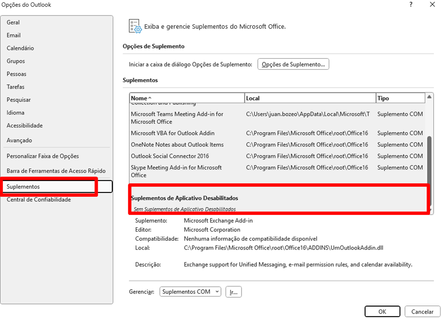 3 – Clique em Suplementos, observe se o suplemento do Microsoft Teams aparece na lista de suplementos desabilitados. OBS: Na imagem fornecida, o suplemento não aparece pois já havia sido reabilitado previamente.