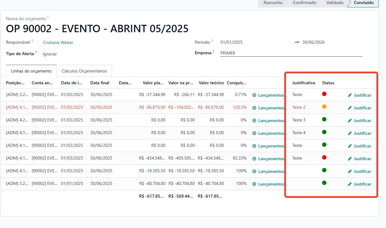 🔹 Status e Justificativas nas Linhas Orçamentárias