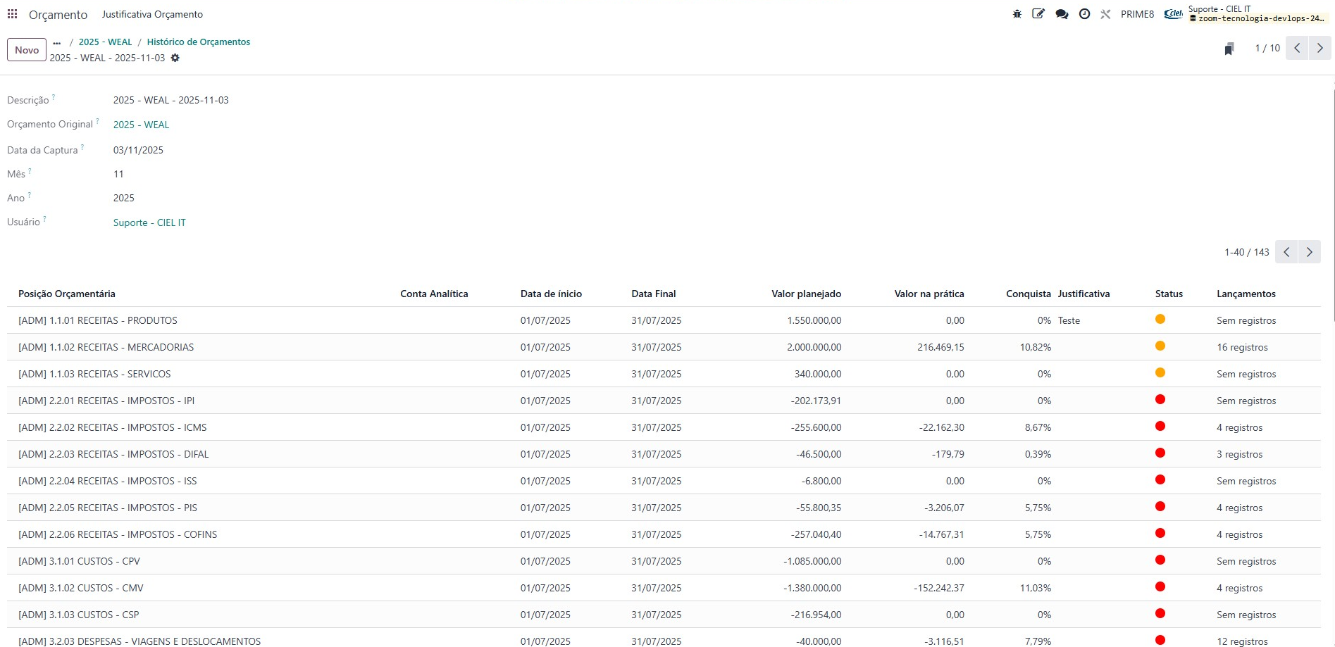 - Sistema de status com farol e justificativa para linhas abaixo do orçado;